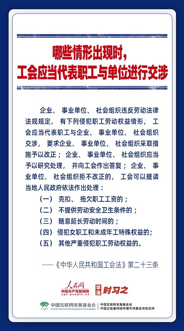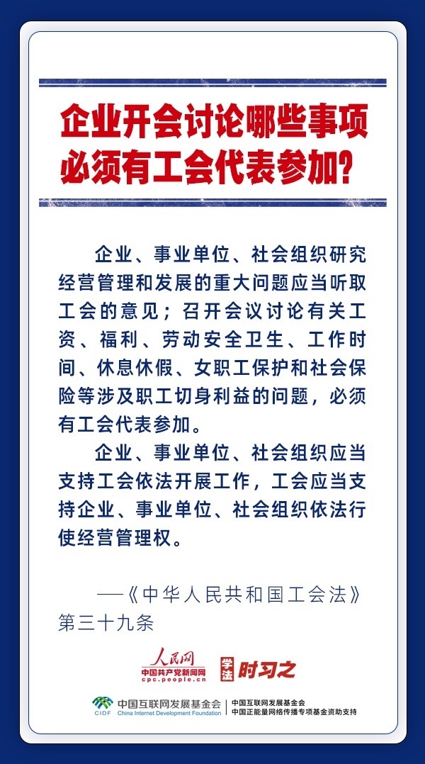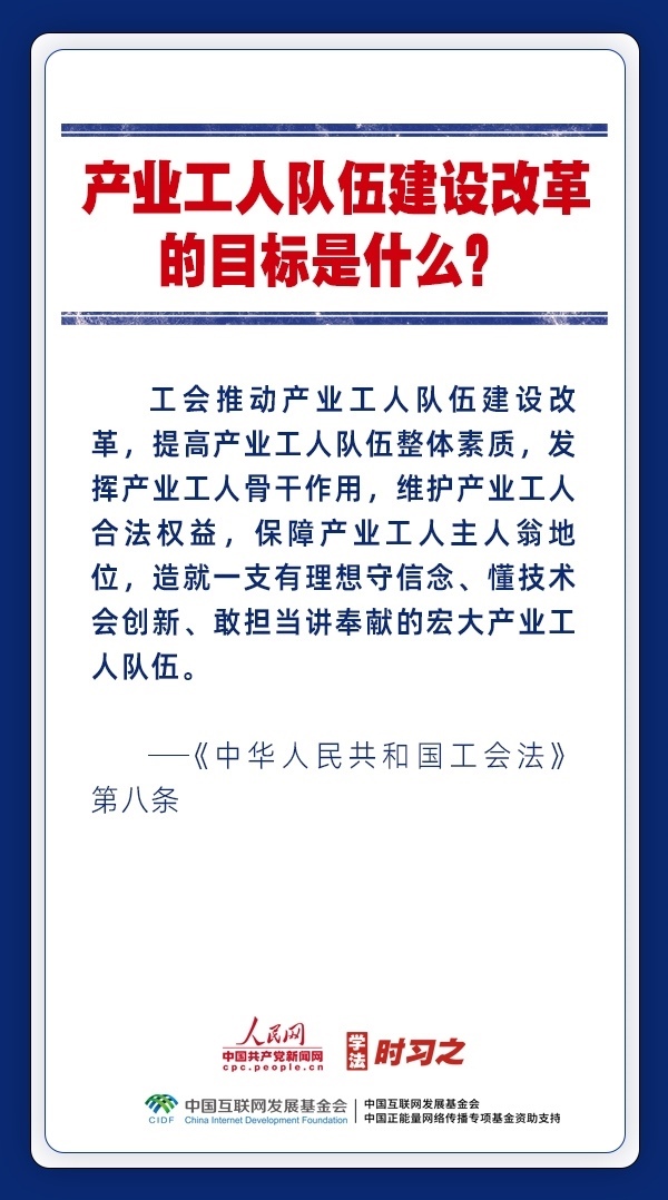 日前,中華全國(guó)總工會(huì)新一屆領(lǐng)導(dǎo)班子產(chǎn)生。黨和政府歷來(lái)重視工會(huì)的地位作用,十分注重加強(qiáng)工會(huì)法律制度建設(shè),專(zhuān)門(mén)為廣大職工制定了《中華人民共和國(guó)工會(huì)法》。網(wǎng)約車(chē)司機(jī)、快遞員、外賣(mài)配送員能入工會(huì)嗎?產(chǎn)業(yè)工人隊(duì)伍建設(shè)改革的目標(biāo)是什么?企業(yè)開(kāi)會(huì)討論哪些事項(xiàng)必須有工會(huì)代表參加?一起來(lái)了解。
