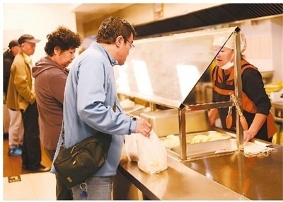 10月13日,吉林省長春市新區(qū)飛躍街道三佳社區(qū)敬老餐廳內(nèi),老年市民正在選取午餐。曹建雄攝(人民視覺)