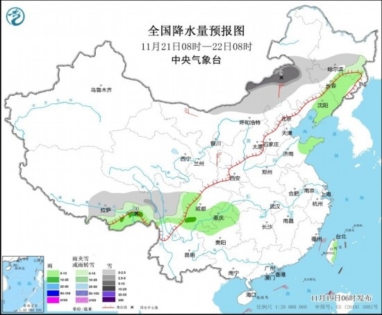 11月21日08時(shí)至22日08時(shí),內(nèi)蒙古中部、黑龍江南部、吉林西部、西藏東南部、川西高原等地部分地區(qū)有小雪或雨夾雪,其中,內(nèi)蒙古中東部、西藏東部等地部分地區(qū)有中到大雪(5~9毫米)。吉林東部、遼寧中東部、山東半島、西藏東南部、四川南部、重慶南部、貴州西北部等地部分地區(qū)有小到中雨,其中,西藏東南部等地部分地區(qū)有大雨(25~30毫米)。內(nèi)蒙古西部和中部、寧夏等地部分地區(qū)有4~6級(jí)風(fēng)(見圖4)。