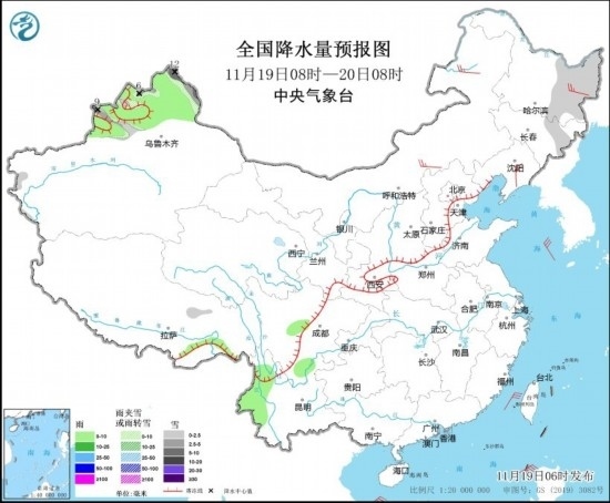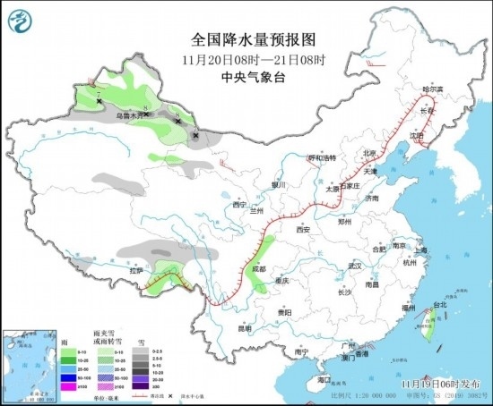 11月19日08時(shí)至20日08時(shí),新疆北部和伊犁河谷、黑龍江東部、吉林東部等地部分地區(qū)有小雪或雨夾雪,其中,新疆北部部分地區(qū)有中到大雪,局地暴雪(10~12毫米)。新疆北部、西藏東南部、四川南部、云南西部等地部分地區(qū)有小雨。內(nèi)蒙古中部和東部、黑龍江東部、遼寧東部等地部分地區(qū)有4~5級(jí)風(fēng)(見圖2)。