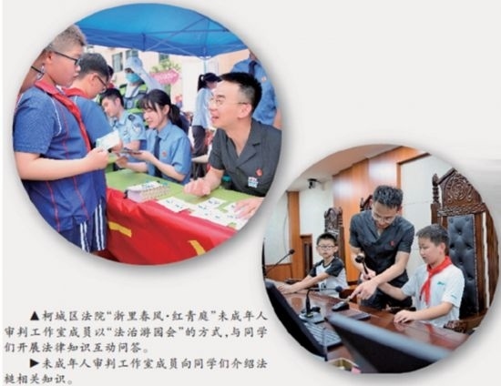“‘紅青庭’品牌Logo中,‘紅’字既突出黨建統(tǒng)領(lǐng)又寓意紅領(lǐng)巾,是百折不撓的精神象征;‘青’字代表著青少年,是肩負(fù)未來的青春力量;‘庭’字則是指少年法庭和家庭?!焙l(wèi)民介紹,柯城區(qū)法院依托“浙里春風(fēng)·紅青庭”品牌,成立青少年法治教育實踐基地和未成年人審判工作室,積極開展內(nèi)外聯(lián)動,在持續(xù)加強涉未成年人刑事、民事、行政審判融合的基礎(chǔ)上,不斷深化與公安、檢察、教育、團(tuán)委、婦聯(lián)等部門的協(xié)調(diào)配合,構(gòu)筑全方位、多鏈條的綜合司法保護(hù)機制。