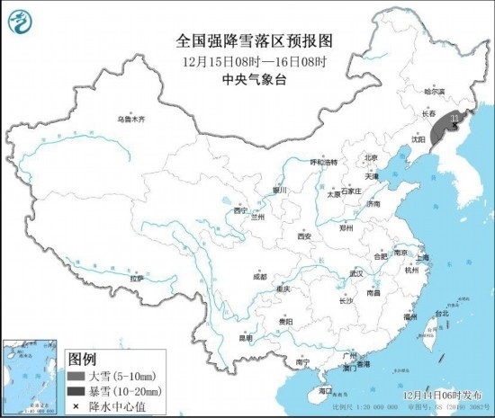 12月15日08時(shí)至12月16日08時(shí),吉林東部、遼寧東北部等地部分地區(qū)有大雪,其中,吉林東部長白山地區(qū)局地有暴雪(10~11毫米)。上述部分地區(qū)新增積雪深度3~8厘米,局地可達(dá)10厘米以上。