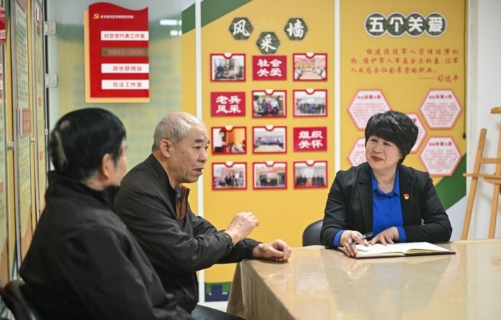在天津市和平區(qū)勸業(yè)場街道兆豐路社區(qū)“家事驛站”,社區(qū)黨委書記王玉枝(右)聆聽社區(qū)鄰里協(xié)調(diào)員的協(xié)調(diào)情況(12月8日攝)。