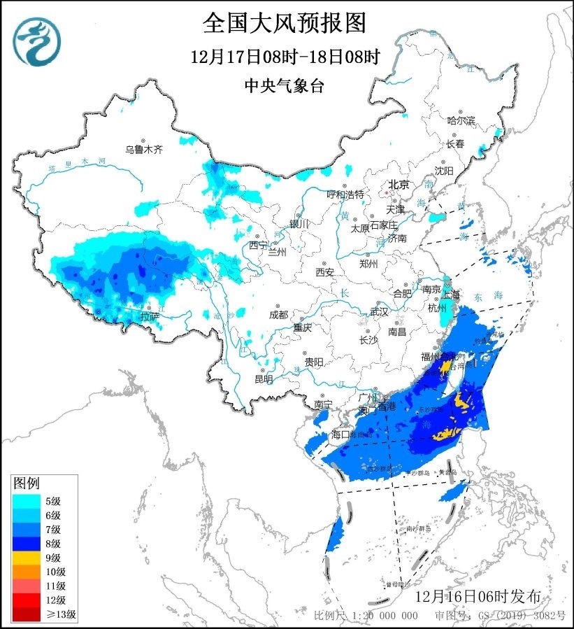 預(yù)計(jì),12月16日08時(shí)至17日08時(shí),內(nèi)蒙古中東部、西藏中西部、甘肅河西、河北北部、山東半島東部、江蘇南部、上海、浙江大部等地有5~6級、陣風(fēng)7~8級的大風(fēng),其中,西藏西北部的部分地區(qū)有7~8級、陣風(fēng)9~10級的大風(fēng);渤海、渤海海峽、黃海大部海域、東海大部海域、臺灣海峽、臺灣以東洋面、巴士海峽、南海北部和中部海域、北部灣將有7~8級、陣風(fēng)9~10級的大風(fēng),其中臺灣海峽、巴士海峽和南海東北部的部分海域風(fēng)力可達(dá)9級、陣風(fēng)10~11級。