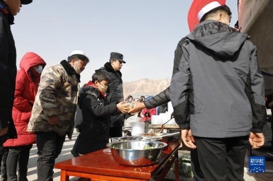 12月19日,在甘肅臨夏積石山縣大河家鎮(zhèn)大河村安置點(diǎn),受災(zāi)群眾排隊(duì)取餐。