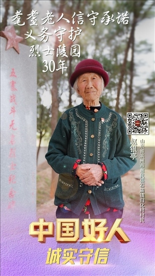 趙銀亭,女,1929年10月生,中共黨員,山東省濱州市惠民縣石廟鎮(zhèn)歸化村村民。趙銀亭是一位有75年黨齡的老黨員。1992年,當(dāng)?shù)亟⒘沂苛陥@,需要一位守陵人,63歲的趙銀亭主動報了名。自此,她與丈夫搬到了距烈士陵園不過15米的舊屋居住。30多年來,她堅守信仰,守護(hù)烈士陵園,為前來參觀的人員講述英烈故事。