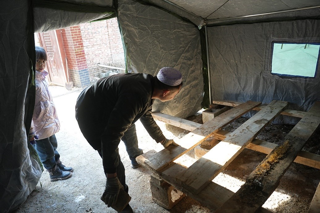 12月20日,馬國忠一家回到村里,拿塑料布在家附近搭了個簡易帳篷,兩根木頭、一條橫梁支起來,怕煙筒把塑料烤化,帳篷里不能烤火,頂多防風(fēng),但馬國忠覺得比車?yán)飶?qiáng)多了。家里的電熱毯拿出來鋪上,他才睡了個安穩(wěn)覺。只是半夜來了余震,又醒了。他止不住想:下一步怎么辦?后面會不會繼續(xù)搖?他家鋼管焊的牛棚頂晃得“乒乒乓乓”響。