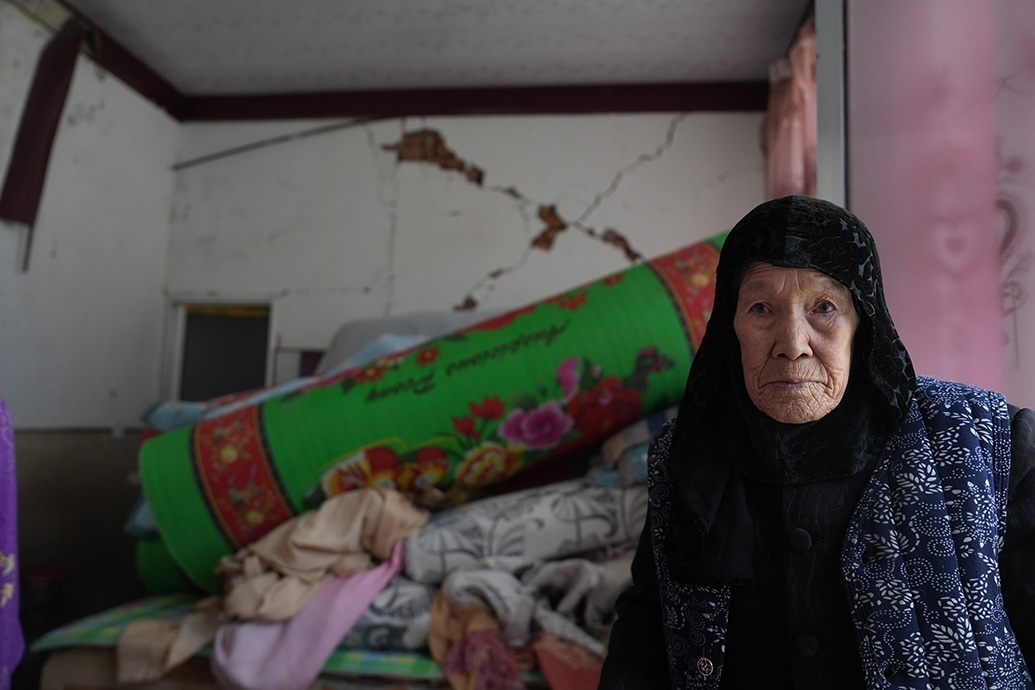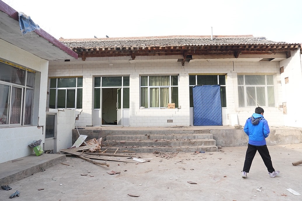 12月23日當(dāng)天,馬國忠和叔叔伯伯兩家都在家門前搭起剛領(lǐng)的帳篷。叔叔馬進(jìn)明家受損嚴(yán)重,兩堵磚墻的銜接處完全開裂,像條拉鏈被猛地拽下;天花板掉了大半,木頭架構(gòu)的屋頂赫然露在豁口里。所幸,他和家人平時在縣城租房住。