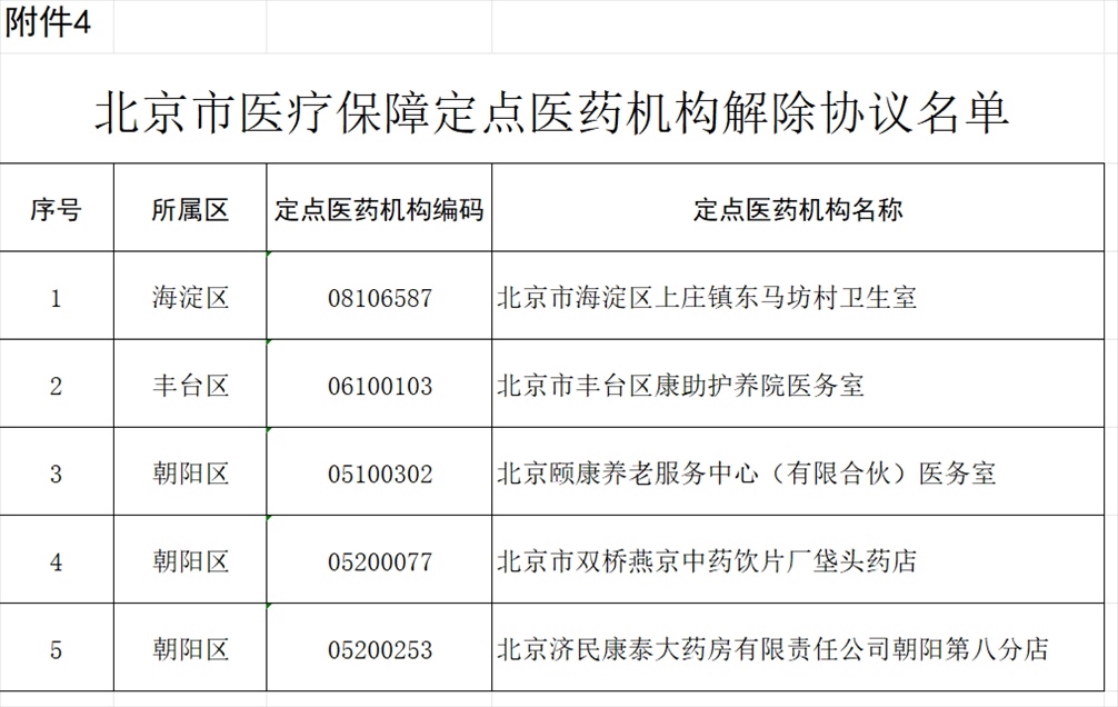 北京市海淀區(qū)上莊鎮(zhèn)東馬坊村衛(wèi)生室等5家定點(diǎn)醫(yī)藥機(jī)構(gòu)因已注銷,申請解除協(xié)議。經(jīng)市、區(qū)醫(yī)保經(jīng)辦機(jī)構(gòu)審核,對上述5家定點(diǎn)醫(yī)藥機(jī)構(gòu)解除協(xié)議(見附件4)。