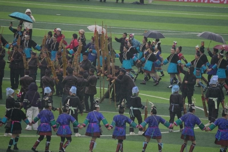 隊(duì)旗招展、蘆笙悅響、鑼鼓喧天……1月6日一早,冒著淅瀝小雨,在貴州省黔東南苗族侗族自治州榕江縣的“村超”球場,歡快的多耶舞和炫目的煙花過后,2024年“村超”賽季正式拉開帷幕。