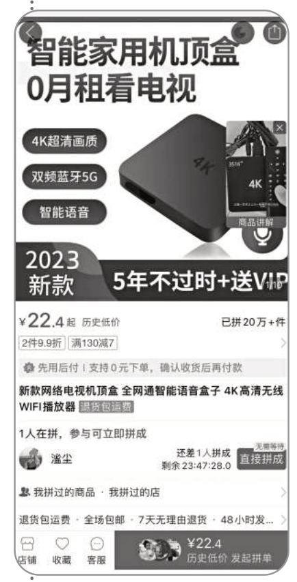 “0月租看電視”“這是一款可以讓你一輩子不用交有線電視費(fèi)的機(jī)頂盒”……在電商平臺(tái)上,一款網(wǎng)絡(luò)電視機(jī)頂盒各型號(hào)版本已售出超過20萬件,在同類商品中銷售量最高。記者購買了一款售價(jià)47.88元的型號(hào),套裝內(nèi)包括機(jī)頂盒、配件以及永久會(huì)員。