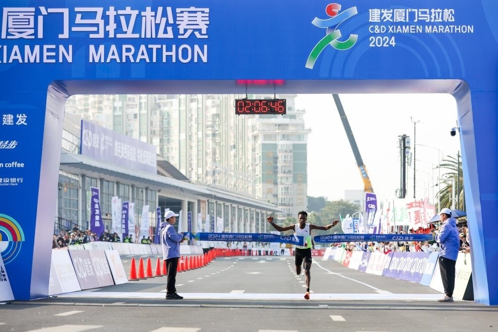 1月7日,埃塞俄比亞選手凱碧貝在廈馬比賽中沖過(guò)終點(diǎn)線。新華社發(fā)(廈門(mén)馬拉松賽事組委會(huì)供圖)