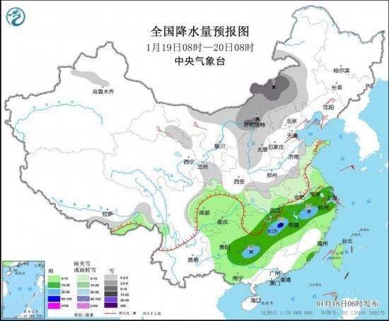 1月19日08時(shí)至20日08時(shí),新疆沿天山地區(qū)、甘肅南部和河西地區(qū)、陜西北部、內(nèi)蒙古中西部和東南部、山西大部、河北西北部、山東東部、河南南部、蘇皖中北部、湖北北部等地部分地區(qū)有小到中雪或雨夾雪,局地有大雪。江南中北部和西部、西南地區(qū)東南部、華南北部等地部分地區(qū)有中到大雨,其中,湖南東北部、江西西北部等地部分地區(qū)有暴雨(50~55毫米)。甘肅河西、內(nèi)蒙古西部、遼寧大部、華北東部、山東半島、江南東部等地部分地區(qū)有4~6級(jí)風(fēng)(見圖2)。