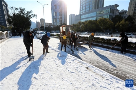 1月23日,在浙江省溫嶺市,人們?cè)谇宄访姹?。近日,受寒潮天氣影響,我?guó)多地迎來降溫降雪天氣,各地積極組織相關(guān)部門開展抗凝除雪工作,保安全保暢通。新華社發(fā)(周學(xué)軍攝)