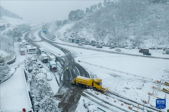 1月22日,在湖南省婁底市一高速收費(fèi)站,除雪車在作業(yè)(無人機(jī)照片)。近日,受寒潮天氣影響,我國(guó)多地迎來降溫降雪天氣,各地積極組織相關(guān)部門開展抗凝除雪工作,保安全保暢通。新華社發(fā)(吳永華攝)