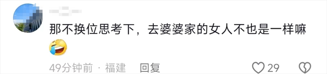 看到“女婿來(lái)丈母娘家的統(tǒng)一狀態(tài)”上熱搜,有的外地媳婦表示,自己也是一樣,在過(guò)年時(shí)充滿尷尬。