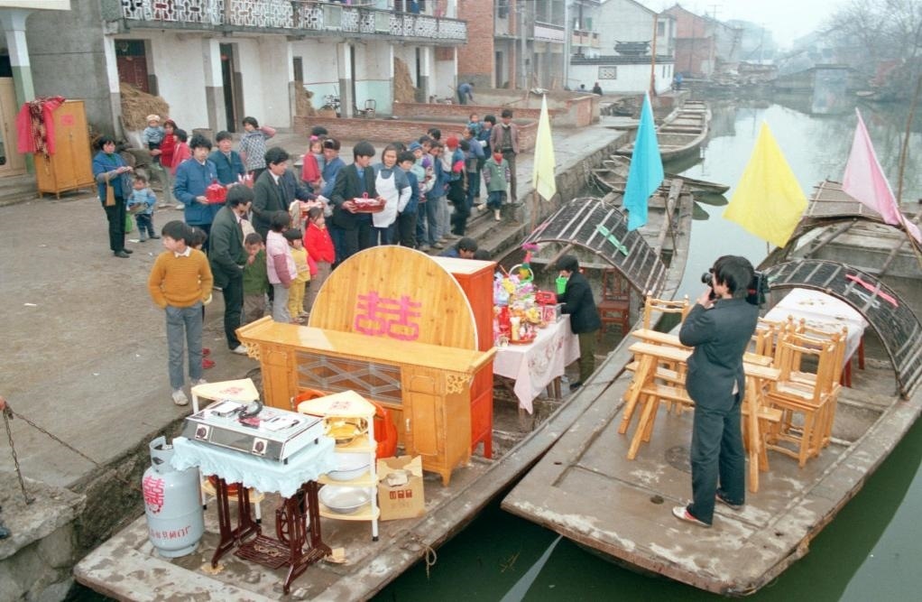 1990年春節(jié)前夕,紹興紅江村的章如花嫁到了一里外的檀瀆村。新郎迎娶新娘所用的交通工具,不是汽車,也不是花轎,而是水鄉(xiāng)里常見的船。富裕起來的水鄉(xiāng)農民在遵循傳統(tǒng)禮儀的同時,也為婚禮增添了現(xiàn)代色彩。比如,陪嫁中少不得電視、煤氣罐;新娘少不得燙發(fā);另一件少不得的,是用攝像機記錄下婚禮的全部過程,作為一輩子的紀念。