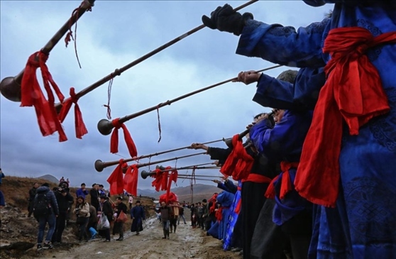 2016年春節(jié)前夕,貴州省惠水縣擺榜鄉(xiāng)石板村村民陳志良按照當地婚俗迎娶吳永云,新郎接親隊伍長鳴長號迎娶新娘。