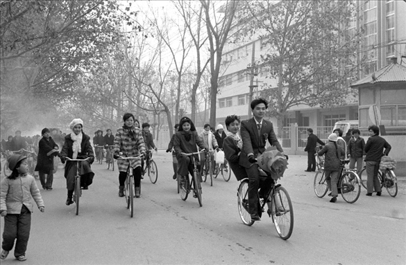 1990年春節(jié)期間,在陜西西安閻良區(qū),胸掛紅花的新郎用自行車馱著新娘經過街頭。那個年代,用自行車接新娘曾經一度成為流行的結婚方式。