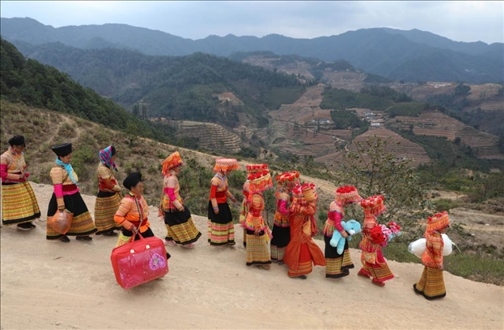 2017年2月21日,在四川省涼山彝族自治州德昌縣南山傈僳族鄉(xiāng)小南山村,新娘張小芳(右四)和送親隊伍帶著嫁妝向男方家走去。每年春節(jié)前后(農歷臘月至次年二月)是當地傈僳族人舉行婚禮的季節(jié)。