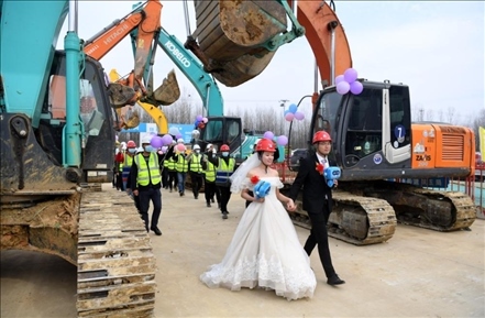 2021年2月8日,中建五局安徽公司合肥聚變堆項目技術人員蔣吉豐和愛人張小菊在項目工地舉辦了一場簡樸、溫馨的婚禮。