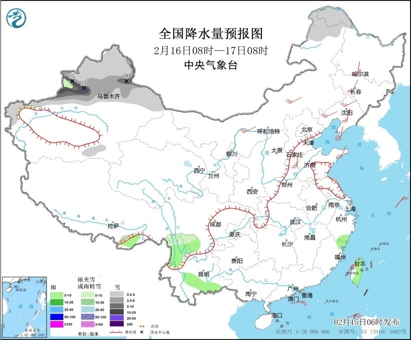 2月15日08時(shí)至16日08時(shí),新疆北部、西藏東部和南部、川西高原中北部等地部分地區(qū)有小到中雪或雨夾雪,其中,新疆阿勒泰地區(qū)有大到暴雪,部分地區(qū)有大暴雪,局地特大暴雪(30~35毫米)。江淮大部、江漢東部、江南、西南地區(qū)東部、華南西部等地部分地區(qū)有小到中雨。西藏中部、內(nèi)蒙古大部、遼寧西部、遼東半島、山東半島、江蘇南部、上海、湖南中北部等地部分地區(qū)有4~6級(jí)風(fēng),其中,浙江中東部部分地區(qū)有6~7級(jí)風(fēng);黃海大部海域、東海大部海域、臺(tái)灣海峽有7~8級(jí)、陣風(fēng)9級(jí)的大風(fēng)(見圖3)。
