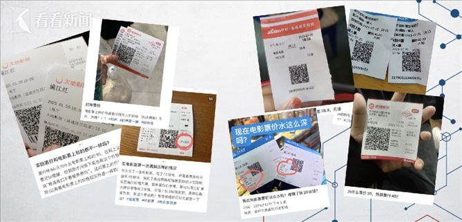 為了求證這一說法,記者來到了網(wǎng)友爆料的這家電影院,并提前通過三種渠道在線上購入了同天、同電影院、同場次、同排位置的三張電影票,分別花費了56元、58元、49元。