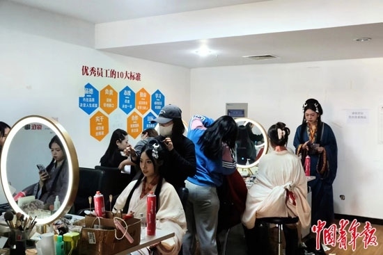 河北省邯鄲市叢臺公園附近一家旅拍館內(nèi),游客排隊(duì)體驗(yàn)漢服妝造。焦晶嫻/攝