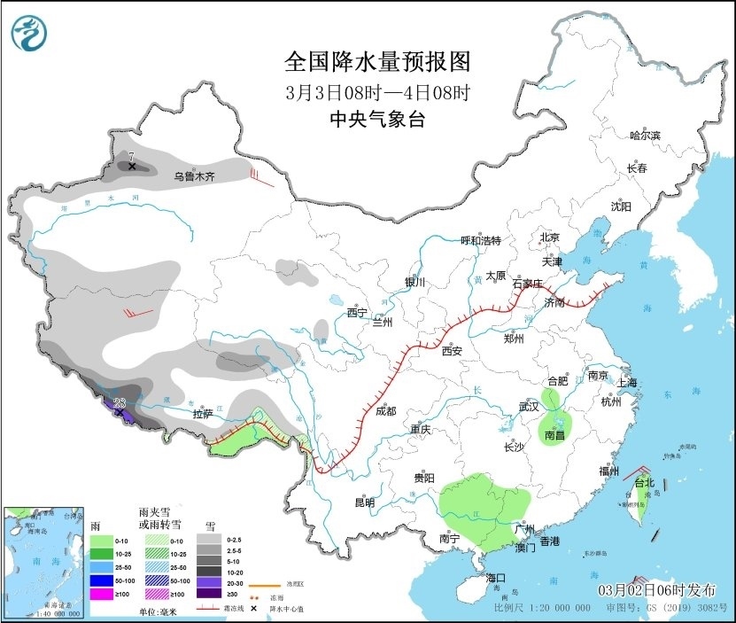 3月3日08時至4日08時,新疆南疆西部山區(qū)、伊犁河谷和沿天山地區(qū)、西藏大部、青海南部等地部分地區(qū)有小到中雪或雨夾雪,其中,新疆伊犁河谷、西藏西南部等地部分地區(qū)有大到暴雪,局地大暴雪(20~28毫米)。西藏東南部、湖北東部、湖南南部、江西北部、廣西中東部、廣東中西部、臺灣島大部等地部分地區(qū)有小雨。新疆東部、西藏等地有4~6級風(fēng)(見圖2)。黃海南部、東海中北部、臺灣海峽、南海北部、北部灣等地有4~5級風(fēng),陣風(fēng)6級。