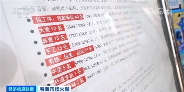 服裝批發(fā)生意的火熱,也帶來了用工需求的增加,不少檔口都貼上了招工的廣告。廣東深圳南油服裝批發(fā)市場批發(fā)商戶 邱林:現(xiàn)在的翻單需求量比較大,大家都在搶工人,現(xiàn)在排單排到快半個(gè)月、十幾天,我們店鋪還在招店員。