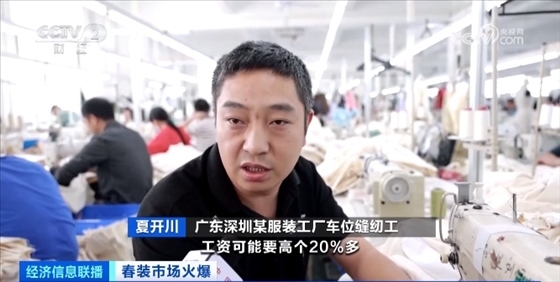 廣東深圳某服裝工廠車位縫紉工 夏開川:比淡季的時(shí)候工資可能要高20%多。現(xiàn)在(車位縫紉工)一個(gè)月1萬多元。