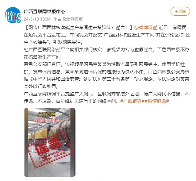 ·廣西互聯(lián)網(wǎng)舉報(bào)中心:“廣西西林核潛艇生產(chǎn)車間生產(chǎn)核彈頭”系謠言。