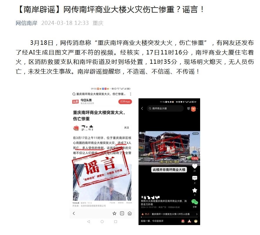 ·網(wǎng)傳重慶南坪商業(yè)大樓突發(fā)大火傷亡慘重?官方辟謠:無(wú)人員傷亡,未發(fā)生次生事故。