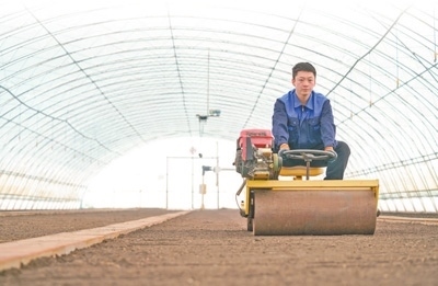 黑龍江北大荒農(nóng)業(yè)股份有限公司友誼分公司智慧農(nóng)場育秧大棚里,職工在進(jìn)行水稻育秧前的地面平整作業(yè)。新華社記者 王 松攝