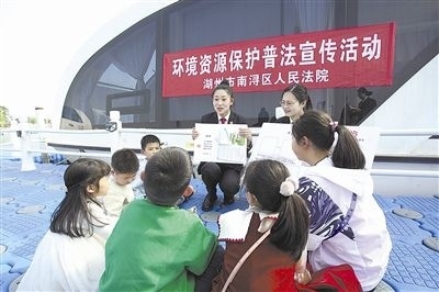 在第三十二屆“世界水日”來臨之際,浙江省湖州市南潯區(qū)人民法院法官走進(jìn)菱湖鎮(zhèn)省級(jí)濕地公園,將水資源保護(hù)和生態(tài)環(huán)境保護(hù)的法律知識(shí)以接地氣的方式向漁民及周邊游客宣講,并通過猜謎語、貼畫板等形式為小朋友上了一堂水資源保護(hù)法治課,形成良好的法治宣傳氛圍。圖為法官給小朋友上水資源保護(hù)法治課。