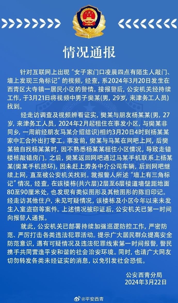 央視網(wǎng)消息:據(jù)平安西青微信公眾號(hào)消息,針對(duì)互聯(lián)網(wǎng)上出現(xiàn)“女子家門(mén)口凌晨四點(diǎn)有陌生人敲門(mén)墻上發(fā)現(xiàn)三角標(biāo)記”的視頻,經(jīng)查,系2024年3月20日發(fā)生在西青區(qū)大寺鎮(zhèn)一居民小區(qū)的警情。接報(bào)警后,公安機(jī)關(guān)經(jīng)持續(xù)工作,于3月21日將視頻中男子樊某(男,29歲,來(lái)津務(wù)工人員)找到。