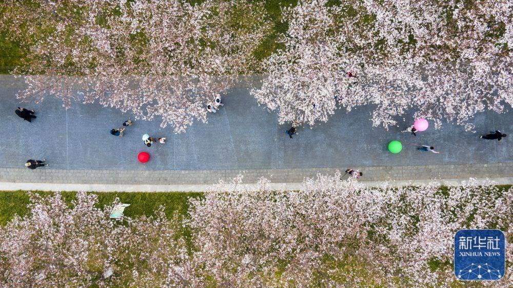3月23日,游人在浙江省金華市國(guó)際友城公園櫻花大道上賞景游玩(無人機(jī)照片)。新華社發(fā)(胡肖飛攝)