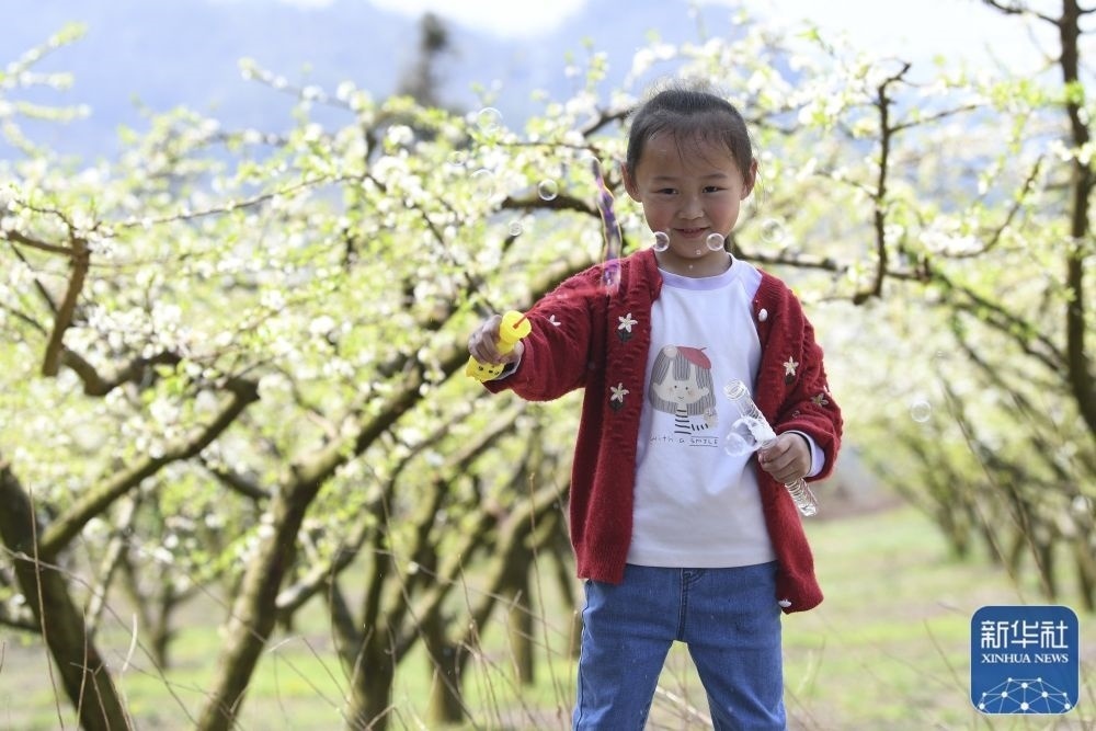 3月23日,小朋友在河北省石家莊市鹿泉區(qū)山南張莊村的杏林中玩耍。新華社發(fā)(閆志國(guó)攝)