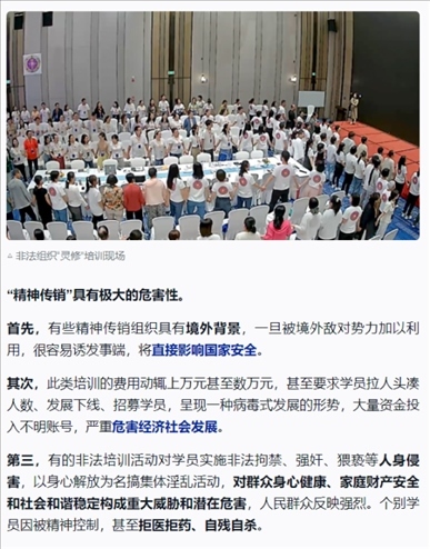 ·起底被公安機關(guān)打擊查處的“靈修”組織:打著“靈修”“靈魂塑造”等旗號,對學員實施精神控制;借“靈修”提升之名,行“精神傳銷”之實。鄧海鵬及其創(chuàng)辦的培訓機構(gòu),打著“靈魂塑造”“集體場域”的幌子,對學員進行精神控制,然后以傳銷、加盟、進階等現(xiàn)代營銷模式達到斂財漁色目的。人前他要求學員全部吃素,自己每天大魚大肉,必吃海參;人前他要求學員不能有不動產(chǎn)、錢是修行來的,自己卻拿著騙來的錢去買理財產(chǎn)品;人前他無兒無女,實則有妻有女;人前假裝不近女色,背地里卻漁色女學員。