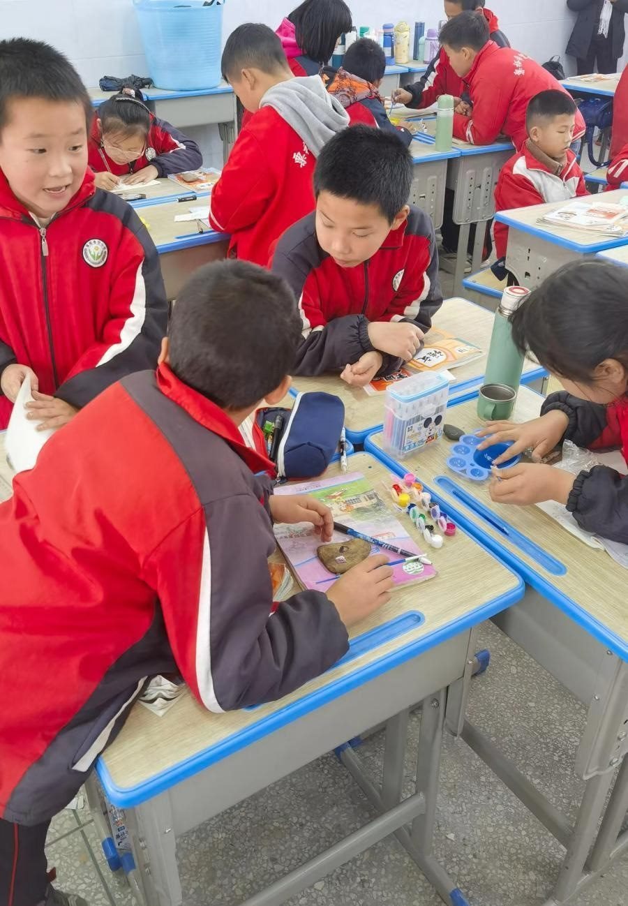 美術(shù)課上,李柏霖讓孩子們?cè)谑^上作畫(huà)