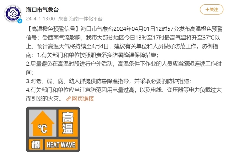 央視網(wǎng)消息:據(jù)@??谑袣庀笈_(tái) 微博消息,??谑袣庀笈_(tái)2024年04月01日12時(shí)57分發(fā)布高溫橙色預(yù)警信號(hào):受西南氣流影響,海口市大部分地區(qū)今日13時(shí)至17時(shí)最高氣溫將升至37℃以上,預(yù)計(jì)高溫天氣將持續(xù)至4月4日,建議有關(guān)單位和人員做好防范工作。