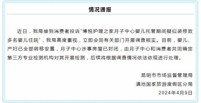 央視網(wǎng)消息:據(jù)“滇池度假發(fā)布”官微消息,昆明市市場(chǎng)監(jiān)督管理局滇池國家旅游度假區(qū)分局通報(bào),近日,該局接到消費(fèi)者投訴“博悅護(hù)理之家月子中心嬰兒托管期間疑似裝修致多名嬰兒住院”,該局高度重視,立即會(huì)同有關(guān)部門開展調(diào)查核實(shí)。目前,嬰兒、產(chǎn)婦已全部轉(zhuǎn)移安置,月子中心涉事房屋已封閉,由月子中心和消費(fèi)者共同確定第三方專業(yè)檢測(cè)機(jī)構(gòu)對(duì)其開展檢測(cè),后續(xù)將根據(jù)調(diào)查情況依法依規(guī)進(jìn)行處理。