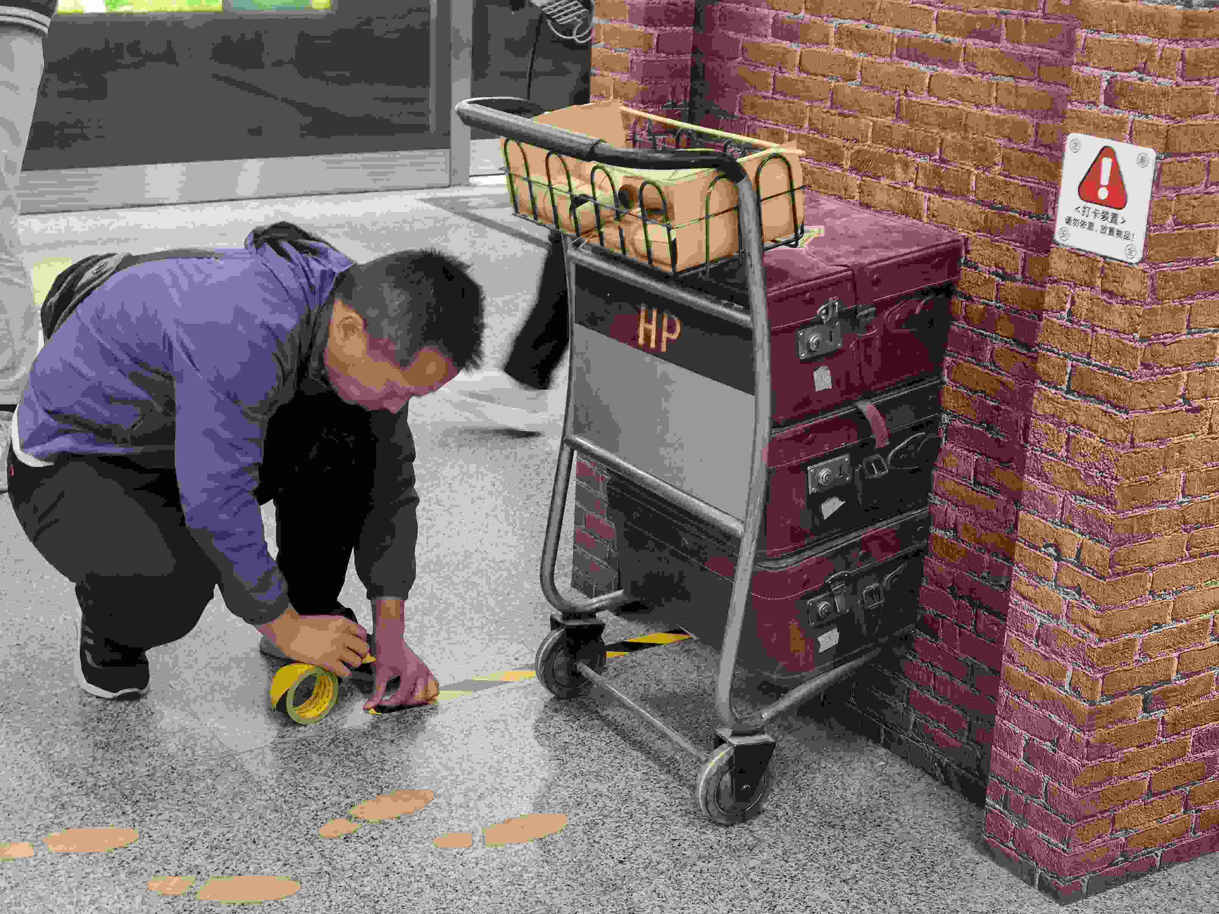 工作人員為裝飾墻周圍貼上警戒線
