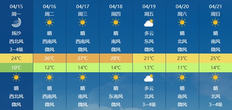 根據(jù)氣象部門(mén)預(yù)報(bào),本周天氣以晴和多云為主,氣溫總體回升,周四白天最高氣溫預(yù)計(jì)將達(dá)到28℃。天氣條件總體適宜出行,晝夜溫差仍較大,還需注意適時(shí)增減衣物,謹(jǐn)防感冒。