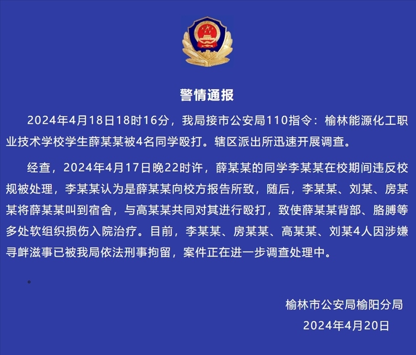 央視網(wǎng)消息:據(jù)陜西榆林公安消息,2024年4月18日18時(shí)16分,榆陽(yáng)公安局接市公安局110指令:榆林能源化工職業(yè)技術(shù)學(xué)校學(xué)生薛某某被4名同學(xué)毆打。轄區(qū)派出所迅速開(kāi)展調(diào)查。