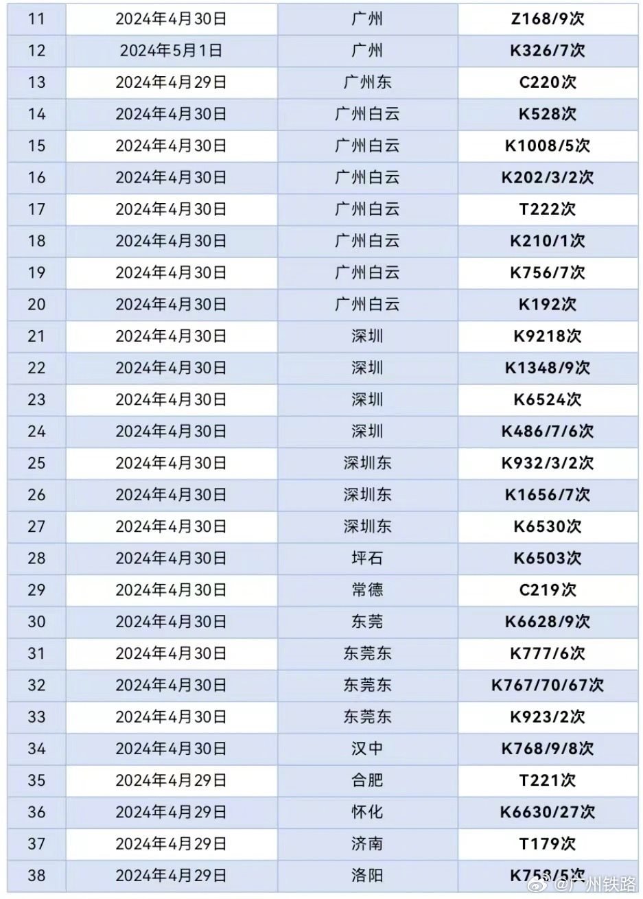 央視網(wǎng)消息:據(jù)@廣州鐵路 消息,據(jù)廣鐵集團(tuán)4月29日12時(shí)通報(bào),根據(jù)氣象部門(mén)消息,近期湖南大部、廣東中北部將出現(xiàn)較大范圍的大到暴雨,將對(duì)鐵路運(yùn)輸秩序造成一定的不利影響。廣鐵集團(tuán)于4月29日至5月1日期間計(jì)劃停運(yùn)京廣鐵路普速列車(chē)62列,京廣、京九普鐵和京廣高鐵的部分列車(chē)將出現(xiàn)不同程度晚點(diǎn)。