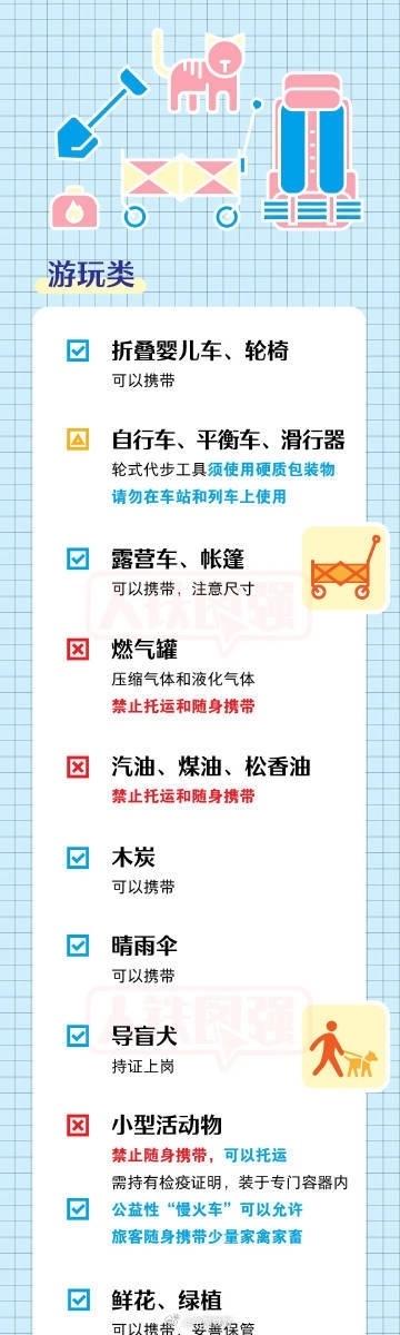 坐火車(chē)出游的小伙伴請(qǐng)注意!有些物品過(guò)不了安檢,出發(fā)前趕快篩查行李單,隨手轉(zhuǎn)發(fā)!①包裝密封完好、標(biāo)志清晰且酒精體積百分含量大于或者等于24%、小于或者等于70%的酒類(lèi)飲品累計(jì)不超過(guò)3000毫升。②充電寶標(biāo)志清晰,單塊額定能量不超過(guò)100Wh。③自噴壓力容器,單體容器容積不超過(guò)150毫升,每種限帶1件,累計(jì)不超過(guò)600毫升。④含易燃成分的非自噴壓力容器日用品,單體容器容積不超過(guò)100毫升,每種限帶1件。