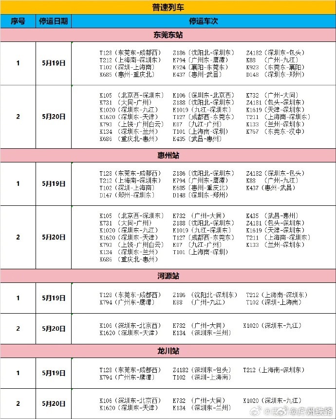 央視網(wǎng)消息:據(jù)@廣州鐵路 微博消息,根據(jù)中央氣象臺(tái)消息,近日湖南西南部、廣東大部有大到暴雨局地有特大暴雨。受此影響,為確保鐵路運(yùn)輸安全,鐵路部門(mén)將對(duì)途經(jīng)京廣、京九普速線等線路列車采取限速運(yùn)行和停運(yùn)措施,同時(shí)各車站列車將出現(xiàn)不同程度晚點(diǎn),由此給廣大旅客帶來(lái)的不便,敬請(qǐng)諒解。東莞東、惠州、河源、龍川站停運(yùn)車次具體如下。