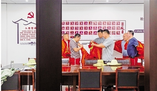 在清湖一村村委會(huì)會(huì)議室,“打鐵花小隊(duì)”邊脫防護(hù)服邊交流經(jīng)驗(yàn)。