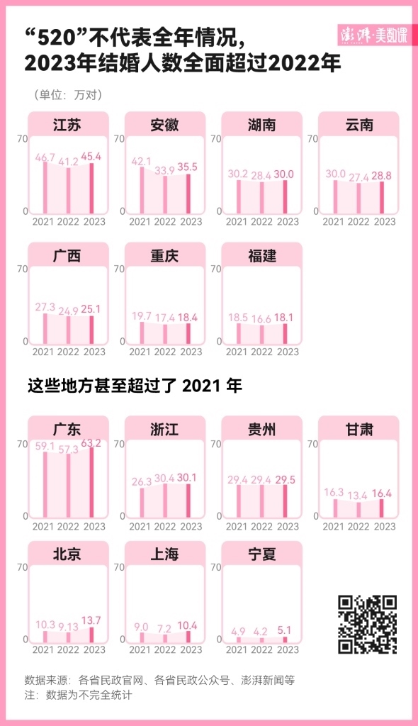 2023 年多地“520”領(lǐng)證人數(shù)下跌,引起熱議。2024 年的“520”剛剛過去,多地披露了當(dāng)日結(jié)婚登記數(shù)。廣東、安徽、江蘇等省當(dāng)日領(lǐng)證人數(shù)較去年有回升。澎湃新聞從深圳市民政局獲悉,截至 5 月 20 日 18 時(shí) 30 分,“520”全天共辦理結(jié)婚登記 1851 對,單日辦理量為近 5 年以來最高。中國人又重燃對婚姻的渴望了嗎?